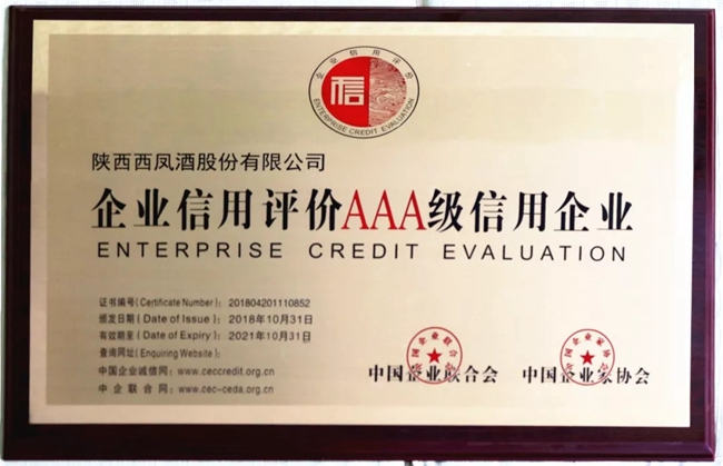 西鳳股份公司榮獲全國“AAA級(jí)信用企業(yè)”榮譽(yù)稱號(hào)