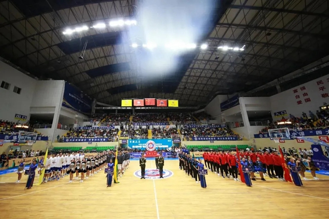 在激昂的樂聲中,裁判員團隊、各參賽隊及啦啦隊紛紛入場。場館中央,一面以籃球、握手、麥穗為元素的會徽十分引人注目,寓意“以籃球為媒,傳承中國白酒文化,增進名白酒情誼”。