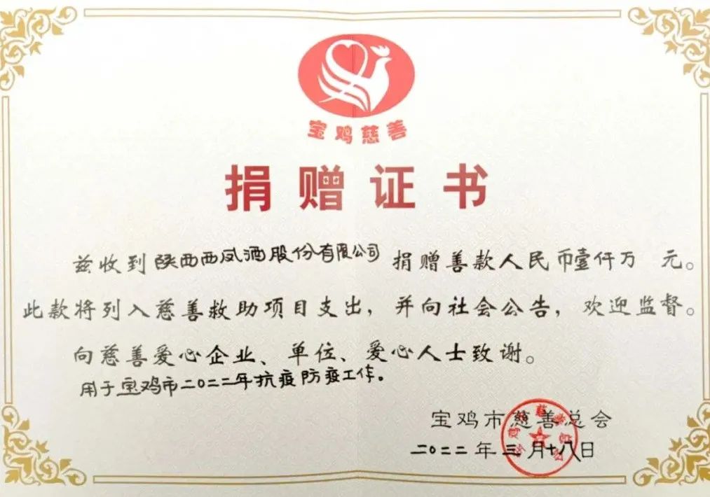 一直以來,西鳳公司熱心公益,彰顯擔(dān)當(dāng)。今年3月18日,西鳳股份公司向?qū)氹u市慈善總會捐贈資金1000萬元,支持寶雞市疫情防控工作。公司還大力實施愛心助學(xué)、抗震救災(zāi)、助力脫貧攻堅、擁軍優(yōu)屬等慈善幫扶事業(yè),始終將把“扶貧濟困、義利兼顧、回饋社會”貫穿于企業(yè)發(fā)展過程,先后榮獲全國“首批精準扶貧最具影響力企業(yè)”“中國企業(yè)社會責(zé)任杰出企業(yè)獎”“中國紅十字會新冠肺炎疫情防控工作特殊貢獻獎”“陜西省紅十字會抗擊新冠肺炎疫情捐贈先進集體”,多次被授予“三秦善星”“寶雞市最具愛心慈善冠名基金捐贈企業(yè)”和“企業(yè)扶貧先進集體”等榮譽稱號。