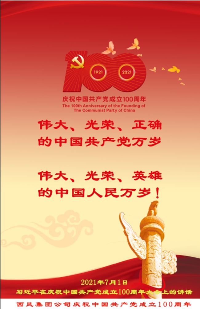 和風舞動,百花嬌艷,紅旗招展。在這舉國歡騰同慶的重大時刻,我們欣喜的迎來了中國共產(chǎn)黨100周年華誕,衷心祝福偉大的黨——生日快樂!在此,西鳳集團公司黨委謹向奮斗在公司各條戰(zhàn)線上的全體共產(chǎn)黨員和黨務工作者,致以熱烈的節(jié)日問候!